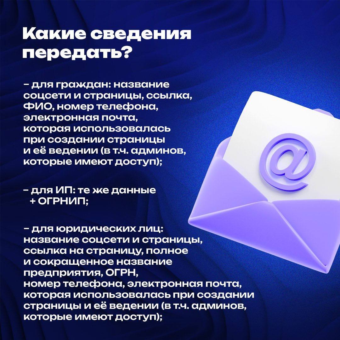 С 1 ноября 2024 года все страницы, которые имеют более 10 000 подписчиков, должны подавать о себе сведения в Роскомнадзор. Если этого не сделать, вам будет запрещено размещать рекламу, принимать донаты, ваш контент нельзя будет репостить подписчикам, а в итоге страницу могут просто заблокировать.
