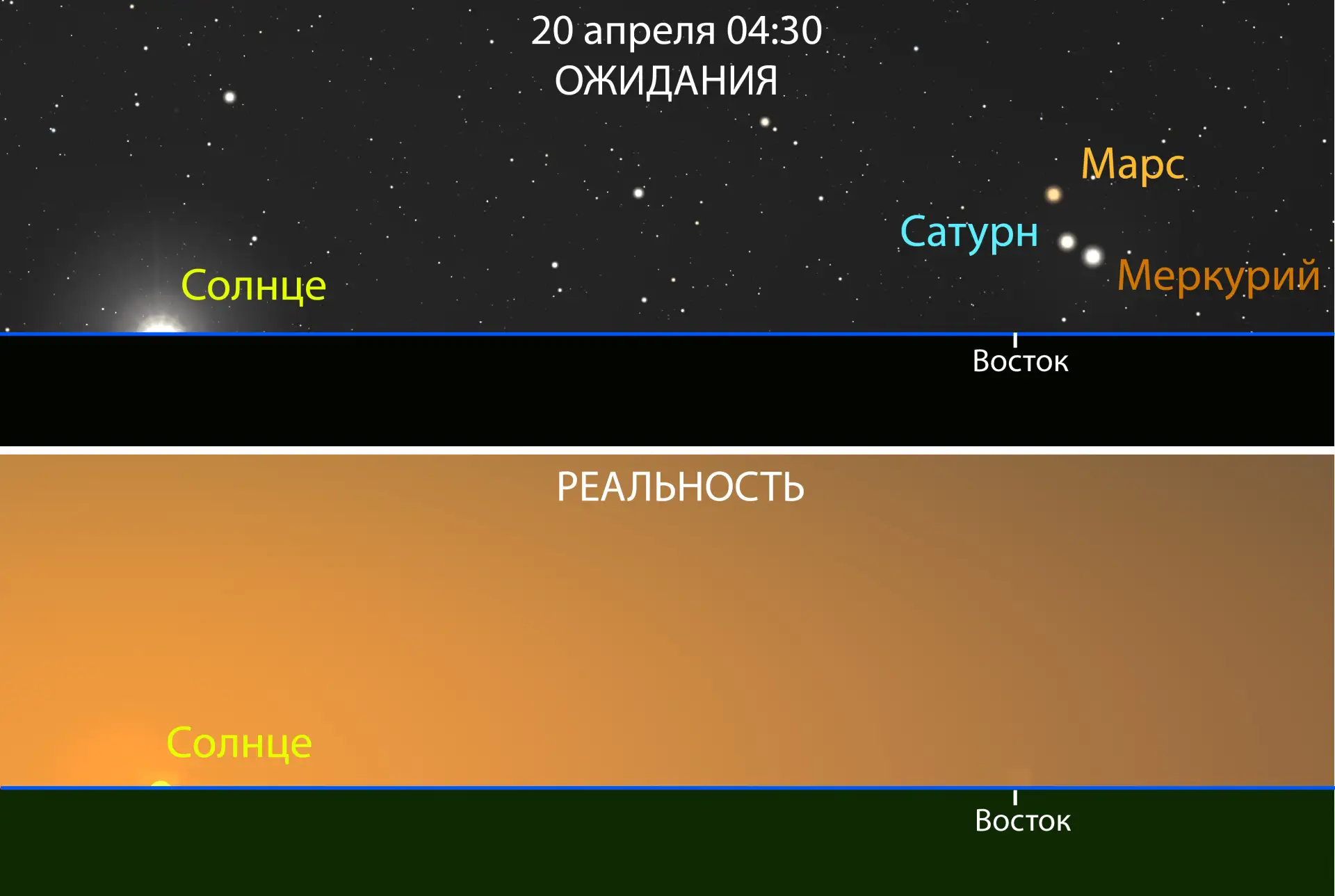 «Не получится его увидеть с территории страны, чтобы вам не говорили в ближайшие 2 дня из каждого утюга. Планеты появятся из-за горизонта рано утром вместе с Солнцем и будут проецироваться на дневное небо <…> Явление, к слову, действительно редкое и красивое, так что жаль», – сообщили в Лаборатории солнечной астрономии ИКИ РАН и ИСЭФ.