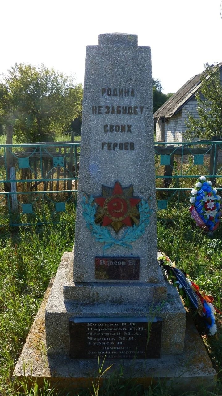 На месте захоронения установлен обелиск с барельефом Ордена Отечественной войны и мемориальной надписью: «Родина не забудет своих Героев».