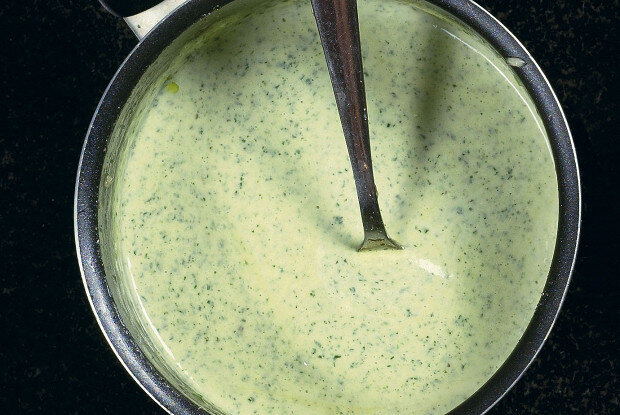 3. При необходимости, добавьте немного воды в получившийся майонез, чтобы добиться нужной консистенции. Соус должен иметь приятную текучесть. После этого аккуратно введите в майонез базилик и добавьте соль по вкусу.