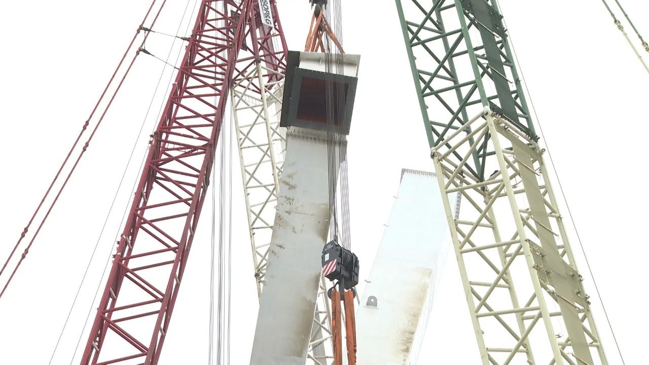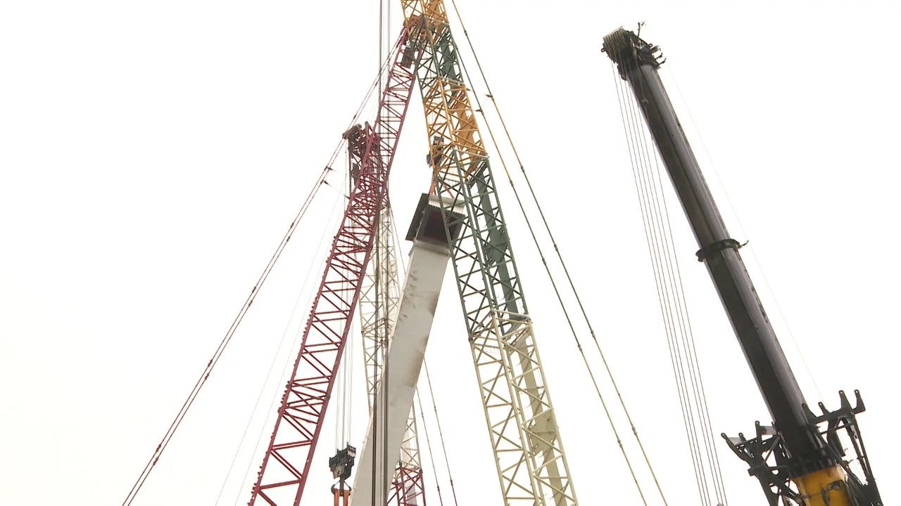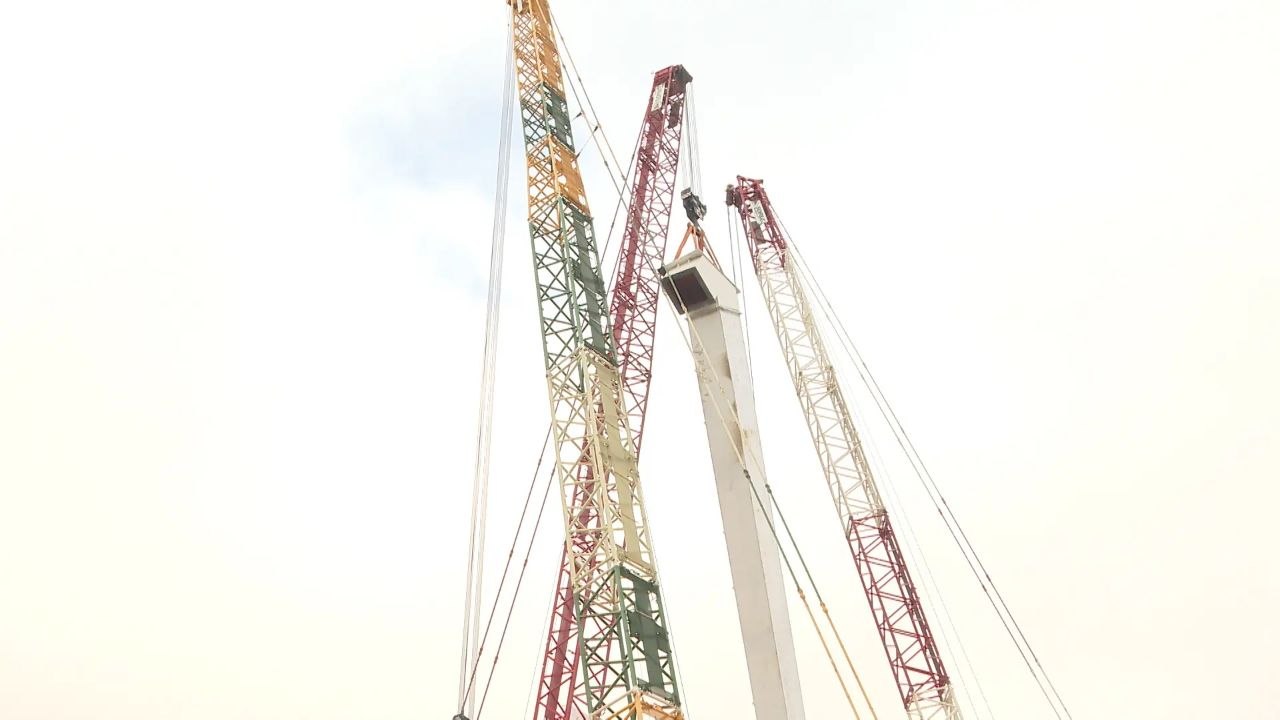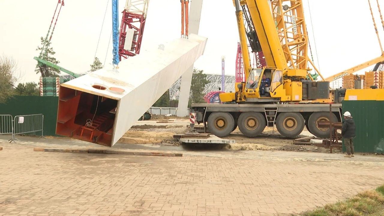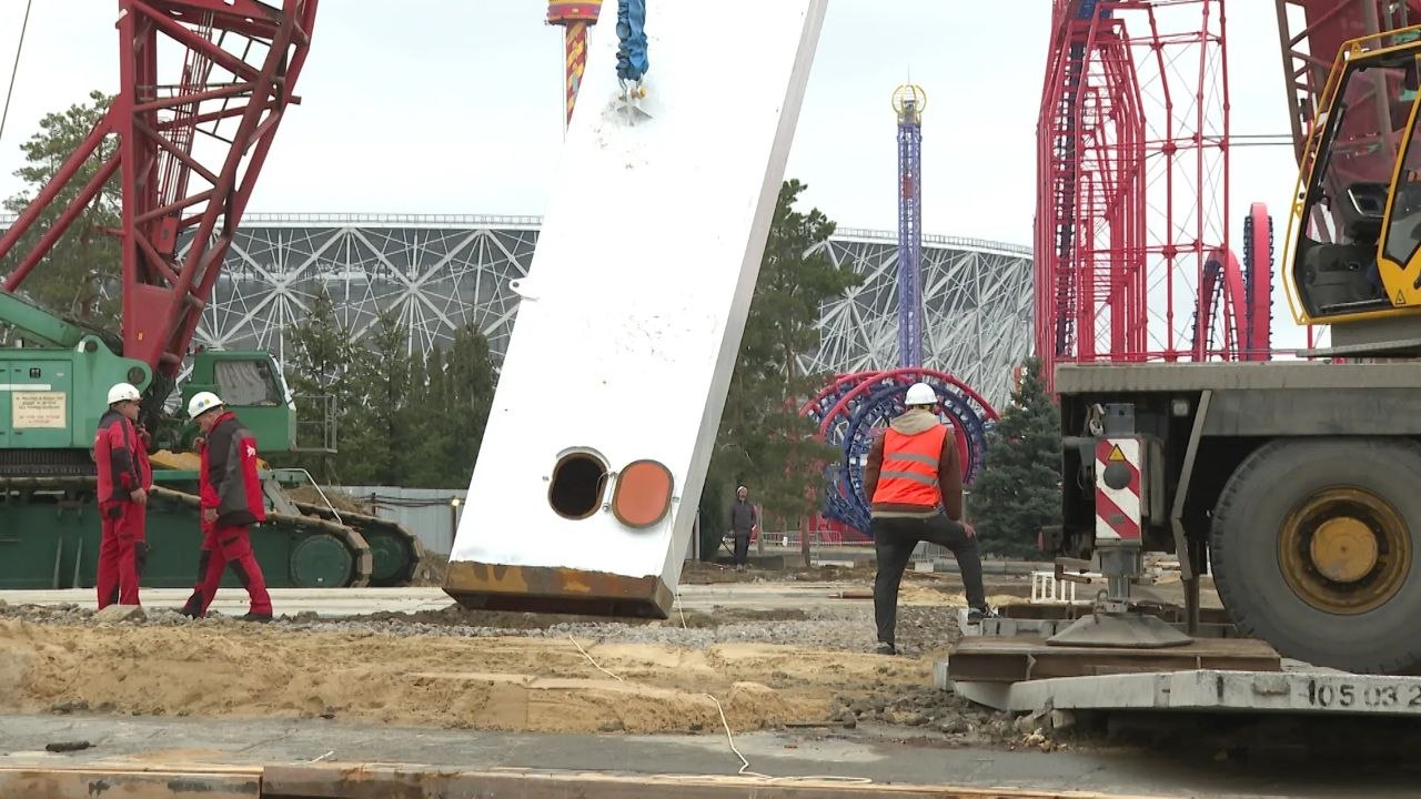 Всего окружность вантового аттракциона будет удерживать шесть колонн, каждая весом 170 тонн. При установке используют одни из самых больших кранов в России – их грузоподъемность составляет 750 тонн.