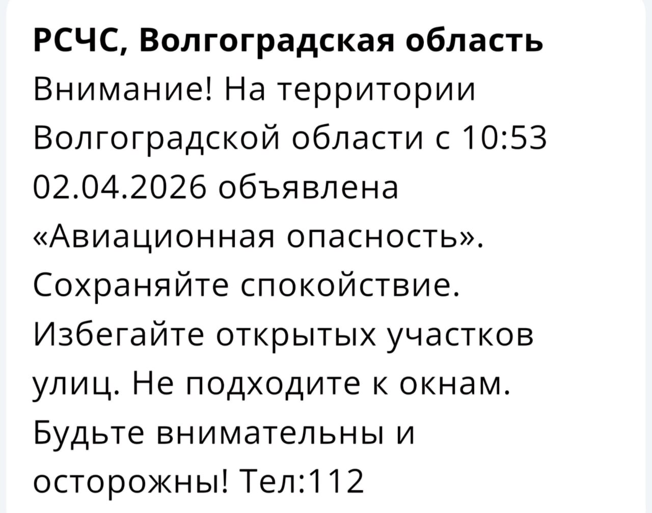 В Волгоградской области утром 2 апреля 2026 года вновь объявили авиационную опасность. Угроза с неба от пилотируемых воздушных судов действует с 10.53 часов, сообщили в РСЧС по региону. Жителям области начинают приходить тревожные сообщения в СМС. Также в Волгограде объявили беспилотную опасность.
