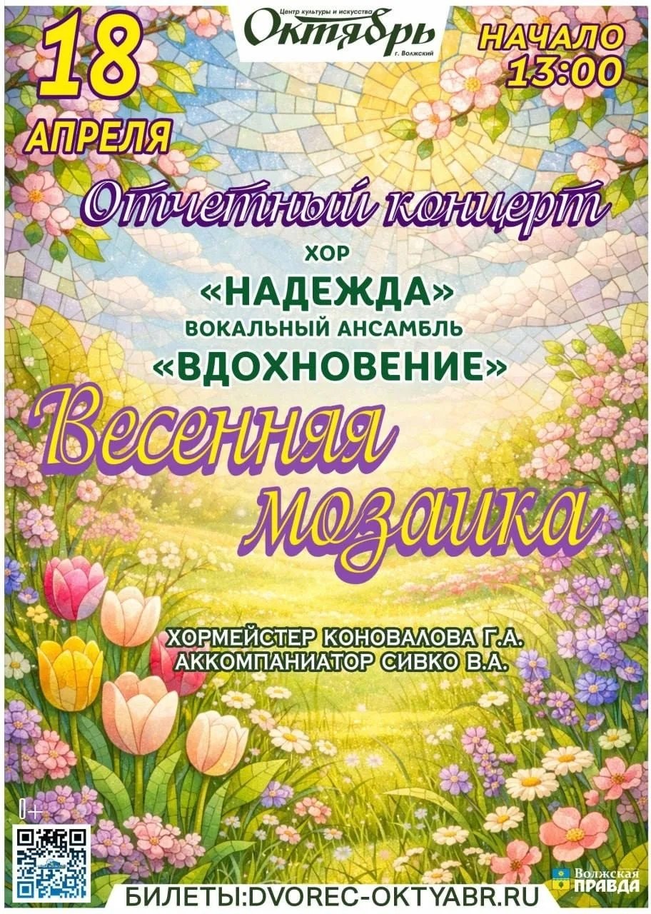 18 апреля в 13.00. «Весенняя мозаика». Отчетный концерт хора «Надежда» и вокального ансамбля «Вдохновение. Купить билет: https://clck.ru/3RsePW