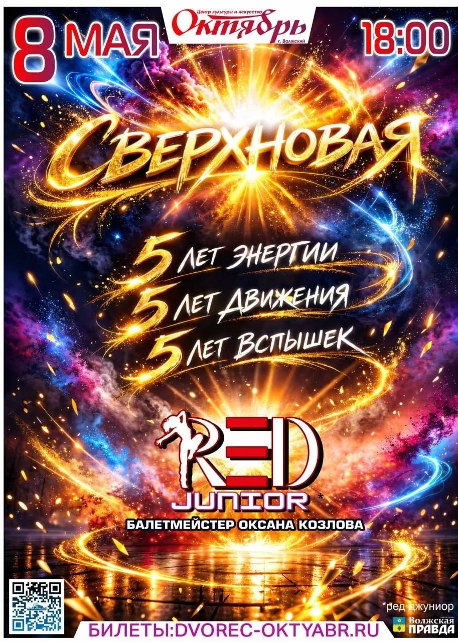 8 мая в 18.00. «Сверхновая». Юбилейный концерт художественного хореографического ансамбля «РЕД ДЖУНИОР». Купить билет: https://clck.ru/3RsePW