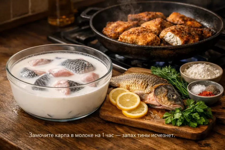 Карп — это рыба, которая вызывает смешанные чувства у многих. С одной стороны, его мясо нежное и сочное, а с другой — некоторые избегают его из-за характерного болотного запаха. Этот аромат может испортить даже самое вкусное блюдо, но существует простой способ его устранения. Замачивание карпа в молоке на один час перед жаркой позволяет избавиться от неприятного запаха и сделать рыбу более аппетитной.