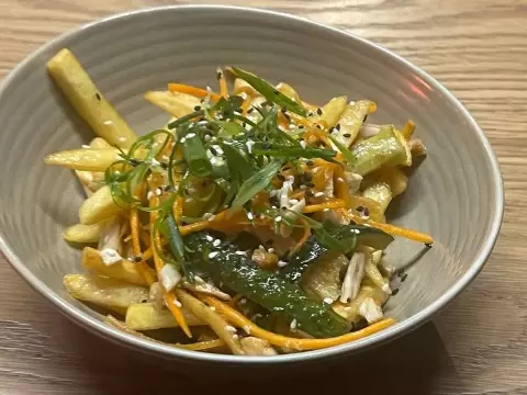 В недавнем эксперименте на фоне работы в популярном заведении Nami возникло угощение, которое сочетает в себе привычное и необычное. Это - картошка фри в сочетании с экзотическими ингредиентами, которое вызвало интерес не только у сотрудников, но и у посетителей заведения.
