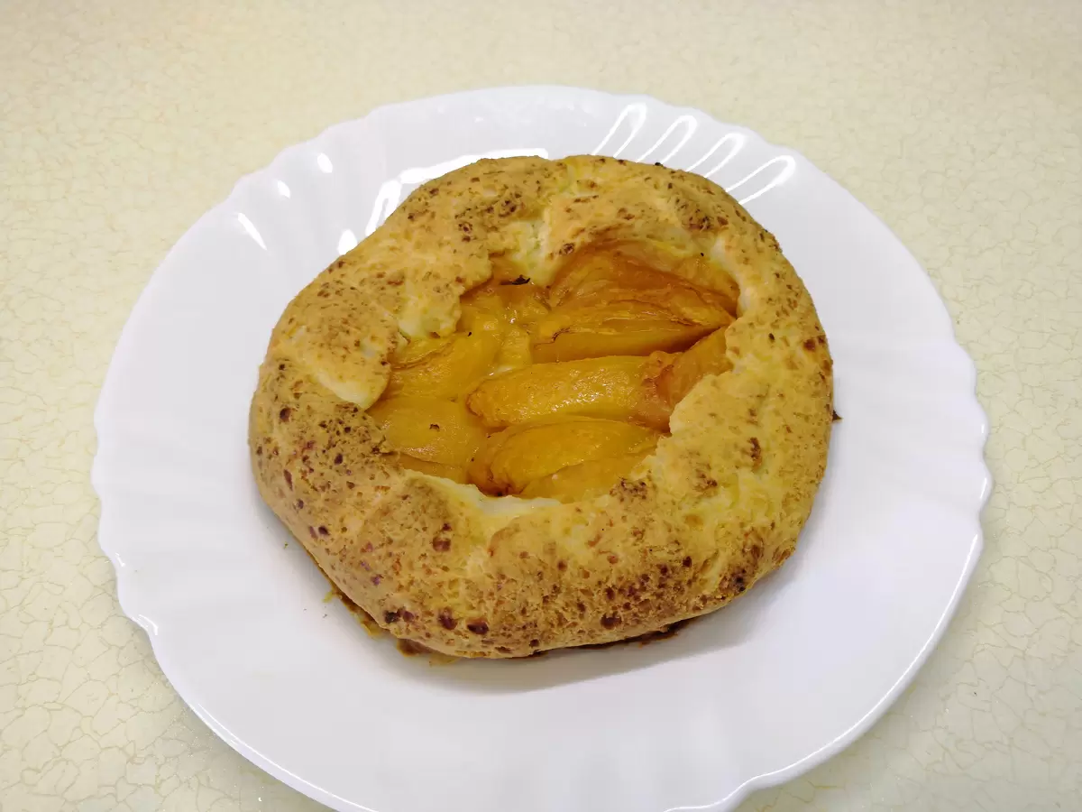 Когда тесто будет готово, его следует выложить на подготовленную поверхность. В центр разместить нарезанные абрикосы, предварительно потрусив их кукурузным крахмалом для впитывания излишков сока. Затем, аккуратно, с помощью бумаги, формируются края галеты. При возникновении трещин не следует переживать — тесто очень мягкое, и его легко исправить, придавая нужную форму влажными руками.