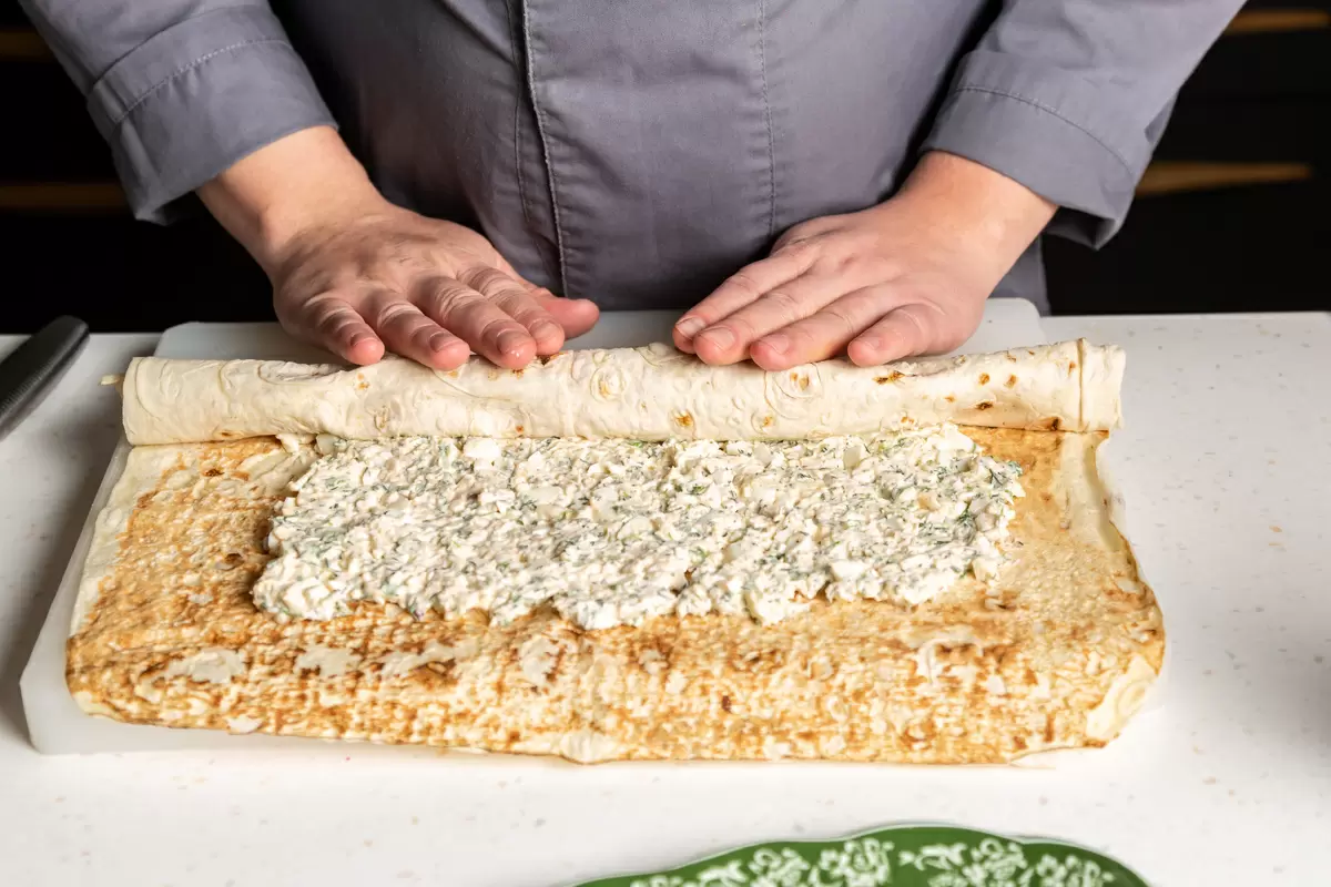 6. Заверните лаваш в виде рулета и нарежьте на порционные кусочки, формируя удобные закуски.