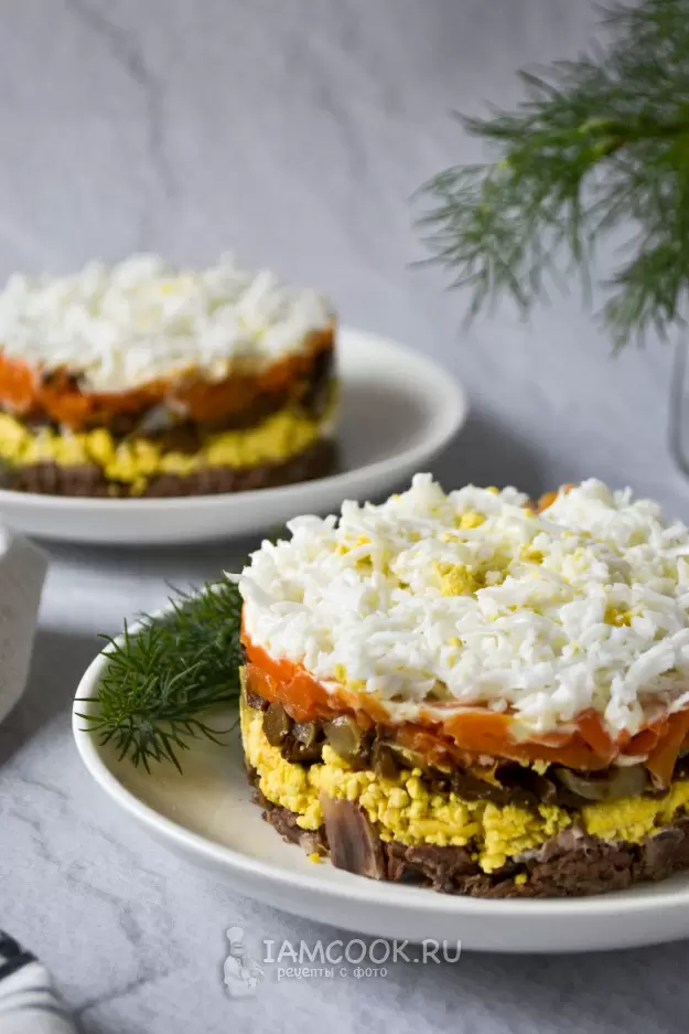 Аккуратно уберите кольцо, и ваш сюрприз готов! Этот плотный, сытный и гармоничный салат станет ярким акцентом любого праздника, особенно на Новом году.