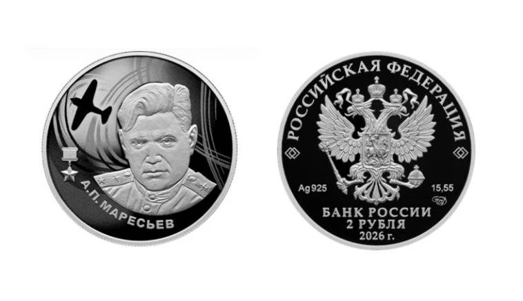 Банк России выпустил серебряную монету номиналом 2 рубля с изображением Алексея Маресьева - летчика-истребителя, родившегося в Камышине Волгоградской области.