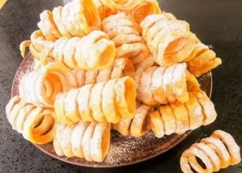 Сформируйте спиральки, накручивая полоски на металлические трубочки или фольгу, если специальных трубочек нет. Обжаривайте полученные изделия в кастрюле с разогретым растительным маслом, не снимая их с трубочек, до золотистой корочки, переворачивая для равномерного подрумянивания.