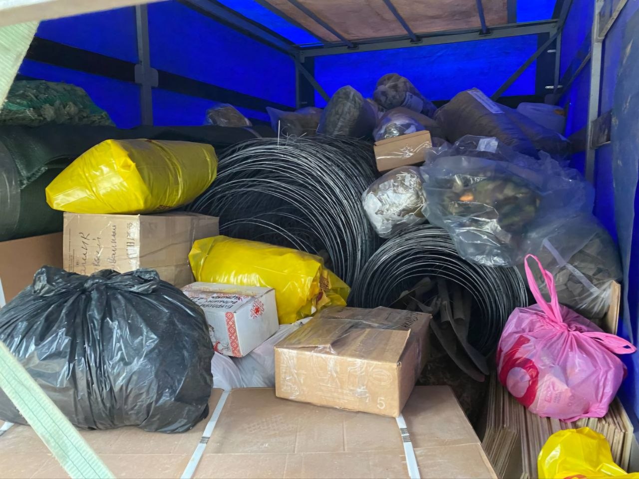 В этот раз упор был сделан на обустройство позиций и быт. Доставили ПВХ-пленку и фанеру для укрытий, затеняющие и маскировочные сети, канистры, огнетушители, а также продукты питания и витамины.