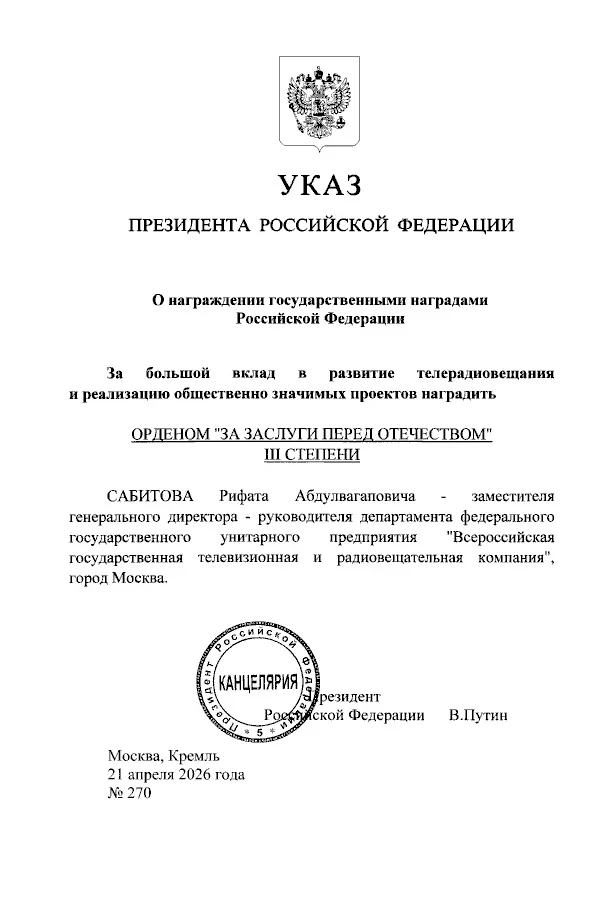 Владимир Путин наградил орденом «За заслуги перед Отечеством» III степени замгендиректора – руководителя департамента ВГТРК Рифата Сабитова
