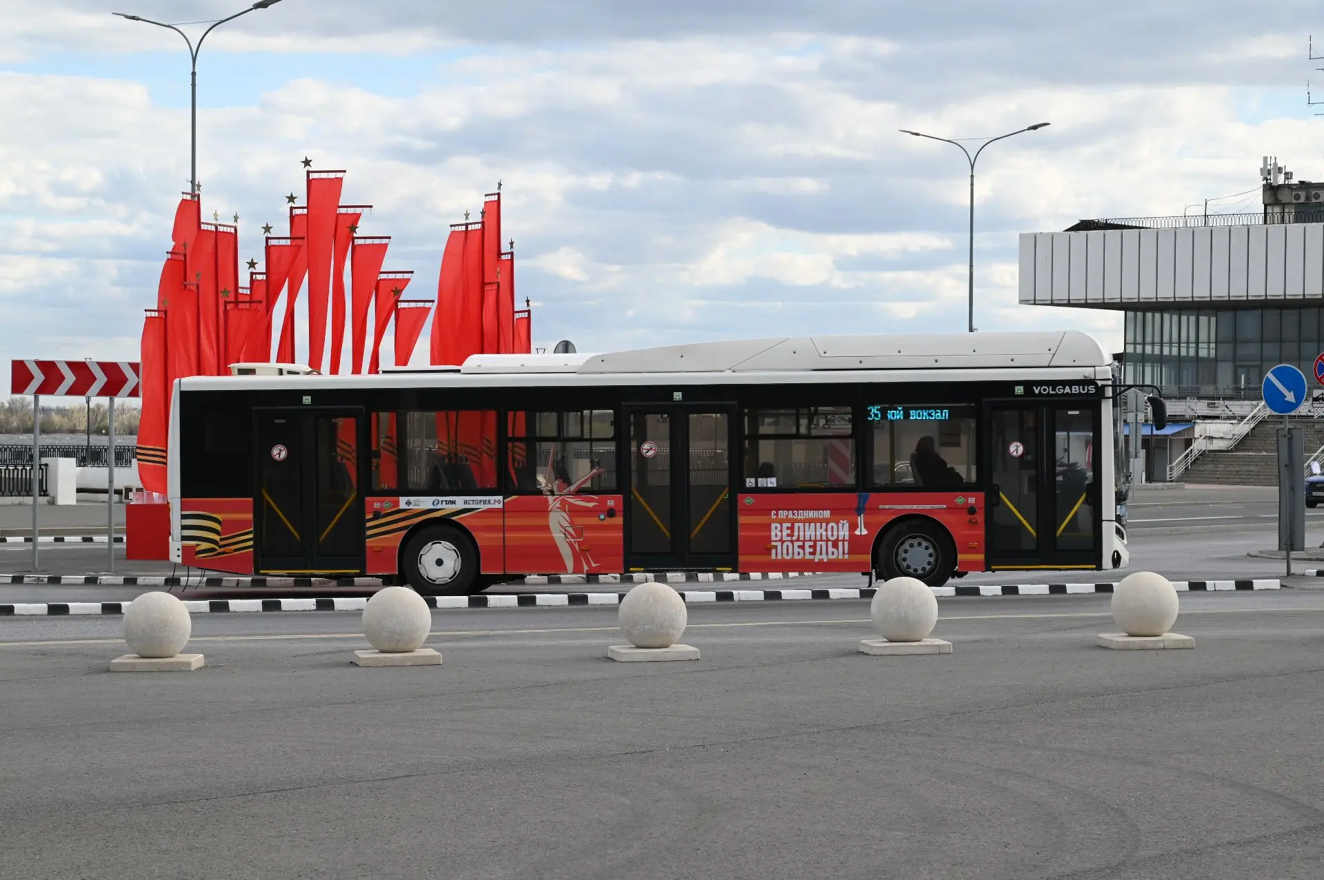 В Волгограде праздничное настроение перед майскими праздниками создают не только алые флаги, но и украшенные победной символикой автобусы и трамваи