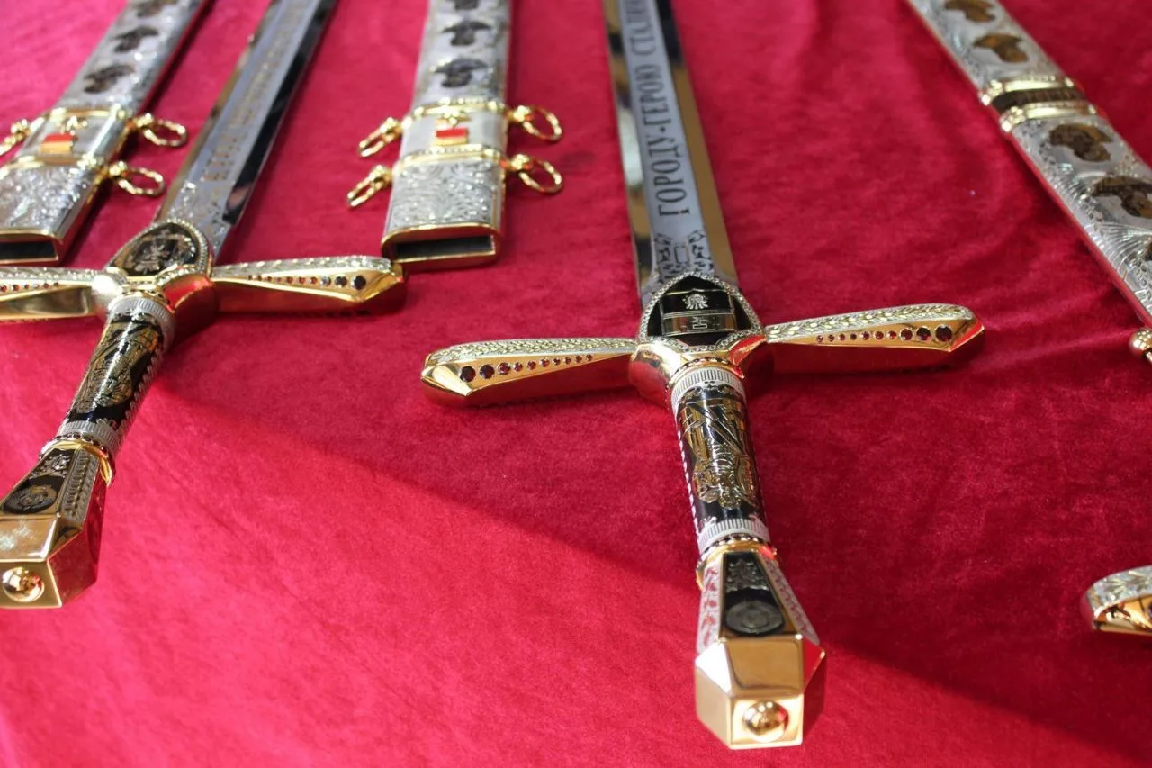 Эксклюзивные клинки для девяти городов-героев России были изготовлены мастерами оружейного завода Златоуста специально к празднованию 70-летия Победы в Великой Отечественной войне.