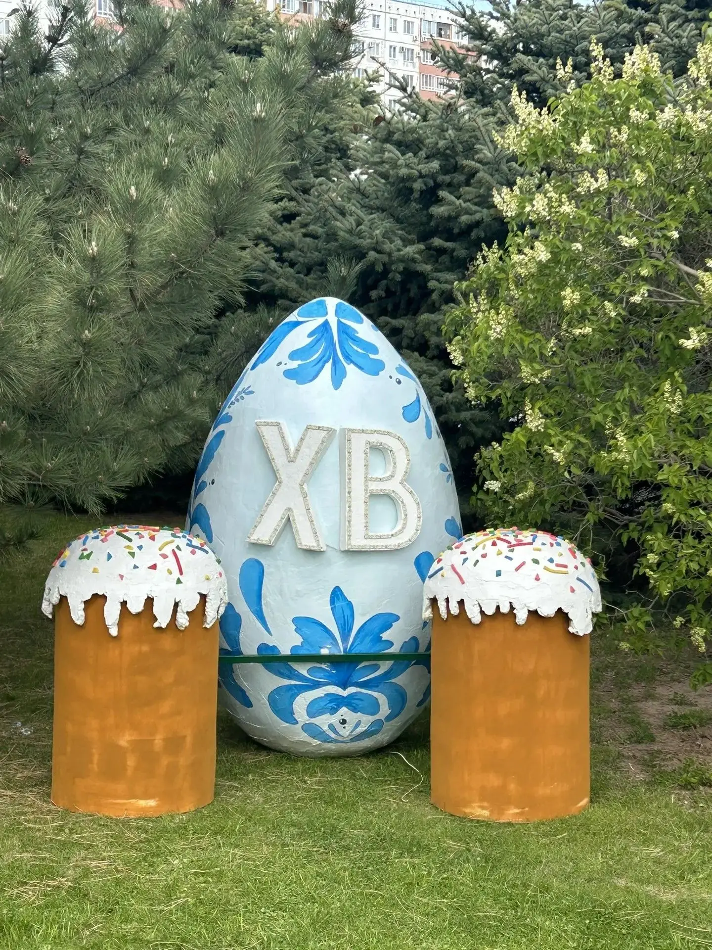 Сегодня около 5 утра в Волжском на проспекте Ленина напротив ЦУМа неизвестный гражданин повредил пасхальную композицию, которую городские службы установили к празднику, и украл один из «куличей».